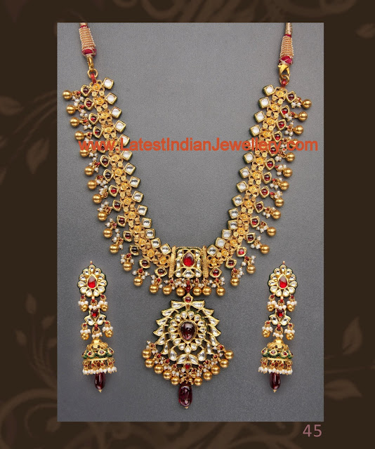 Gold necklace and gold necklace set are the centers of attraction for most women during the time of weddings and marriages. Wedding wear antique gold mughal neckalce set. Antique gold balls necklace jewellery designs.