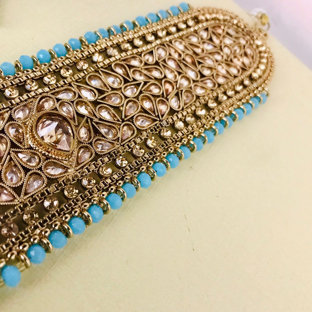 Rhinestone romance gold choker set 1 set remaining. 22k gold choker collar necklace and chandlier earring set, hand paint, length of the necklace is adjustable from 14.0 inches to 14.75 inches, back chain maximum width is 5.0 mm, width is 30.0 mm ( 1.2 inches ) center portion length is 60.0 mm ( 2.4 inches ) width is 44.0 mm. Regular price $150.00 usd sale price $45.00 usd save 70%. This gorgeous 22 karat gold choker necklace set with earrings is from vummudi bangaru jewellers (vbj).